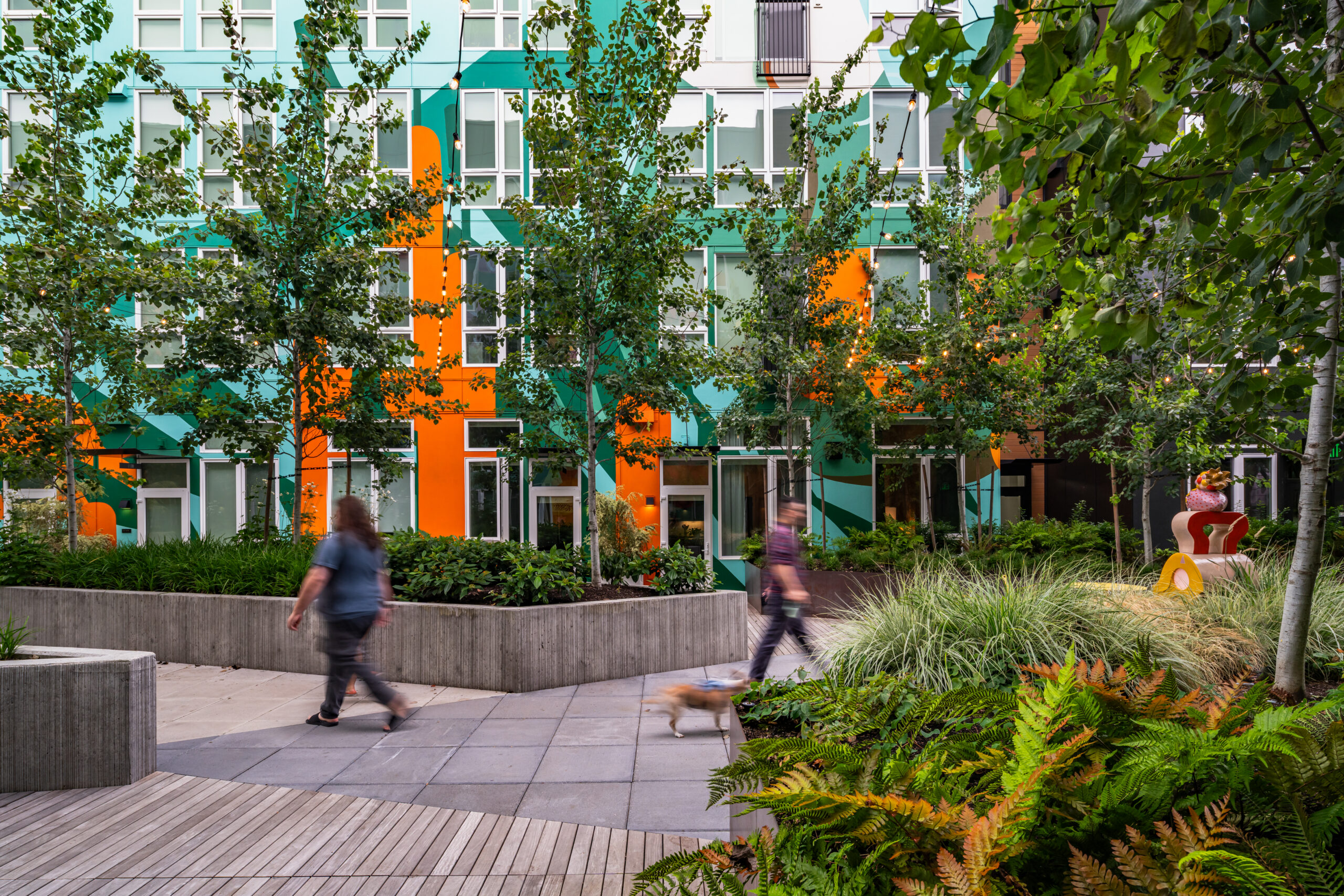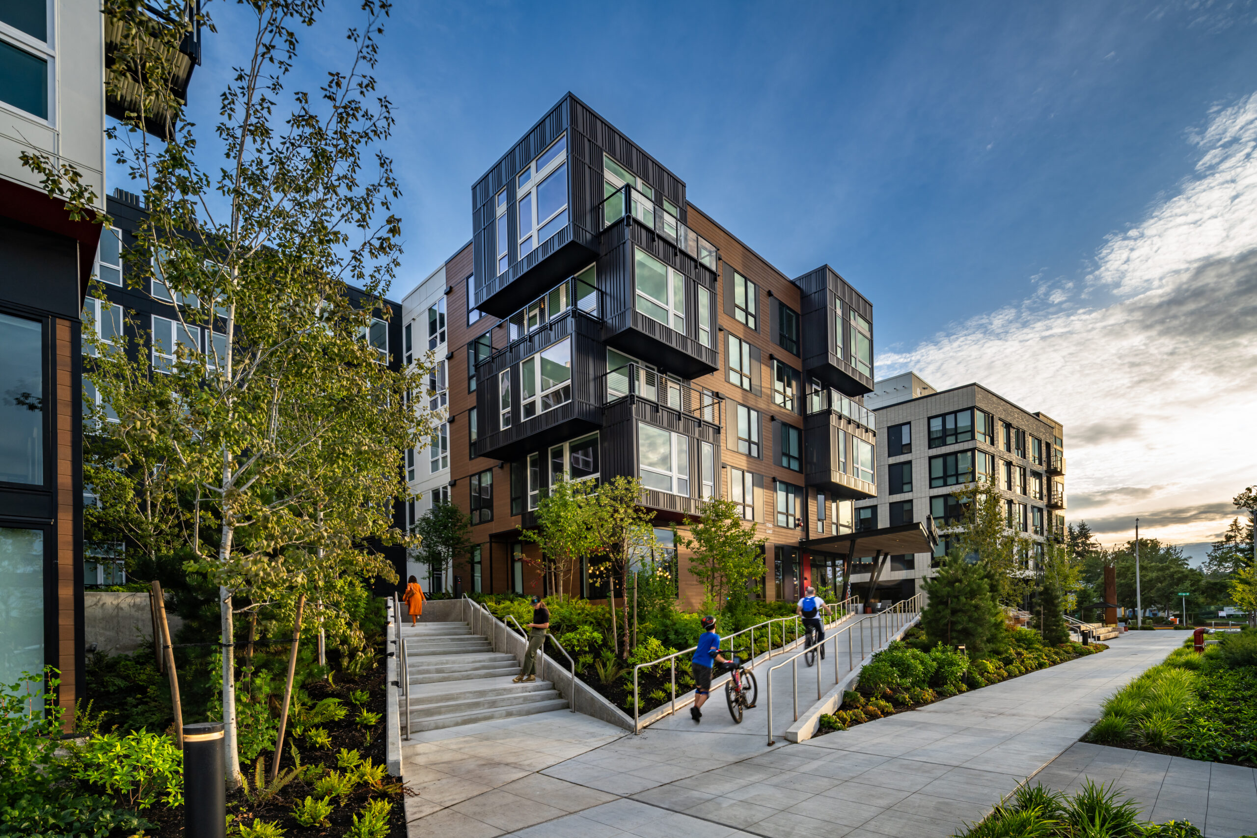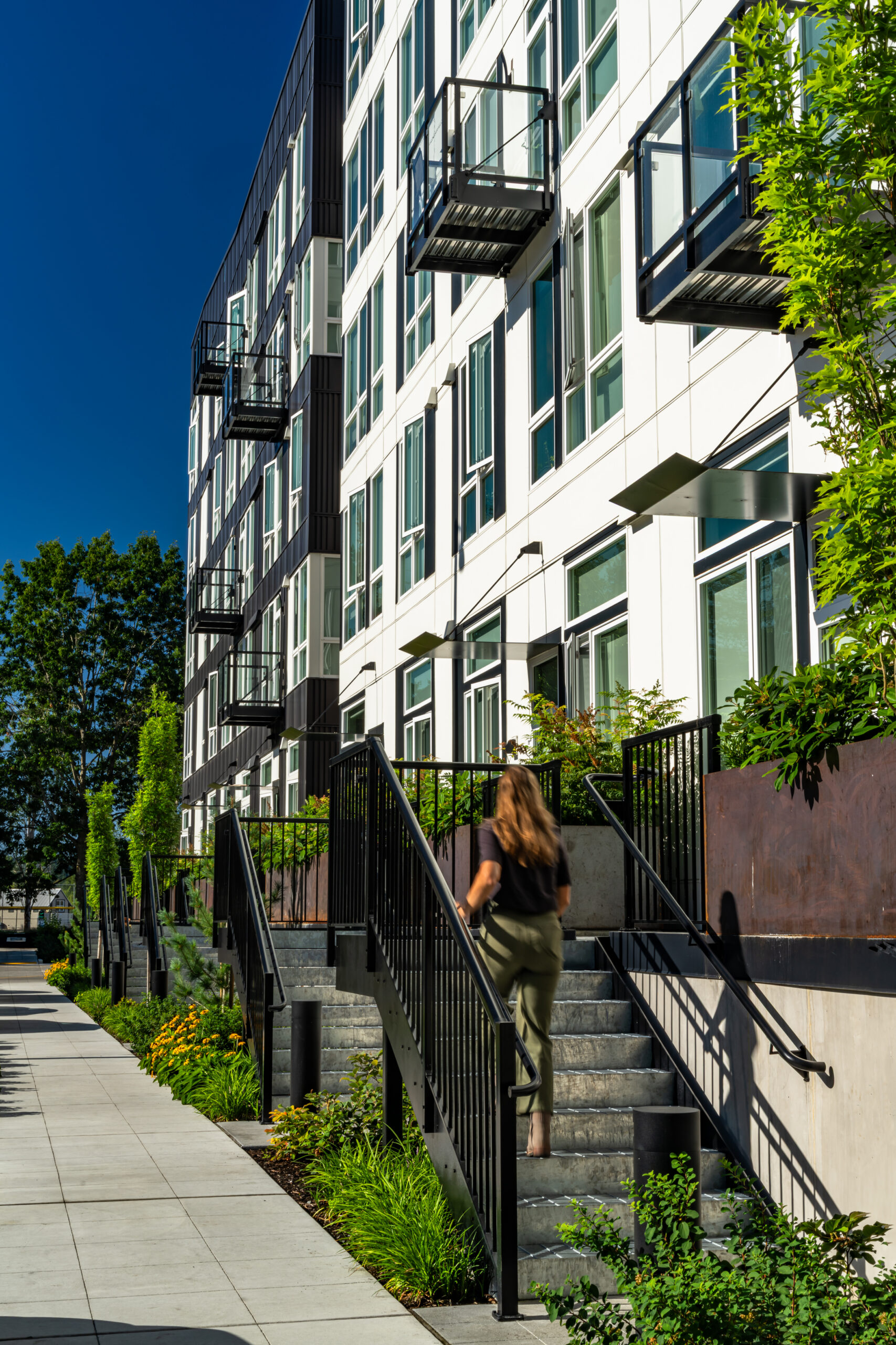 The Piper landscape design provides a rich and lively pedestrian experience that serves as a gateway from the Marymoor Design District to the adjacent Marymoor Park. The ‘Woonerf’-style streets to the east and west and central public art walk provide pedestrian and bike friendly conditions that allow for easy access to the East Link transit station. A generous public art plaza in the northwest has abundant seating for informal gathering, and two community gardens to the south provide a public open space for both food production and community gathering and celebrations. The main gathering for residents is centered around the pool and interior/exterior resident lounge. These areas will accommodate a wide range of amenities and will serve as the heart of the resident community.