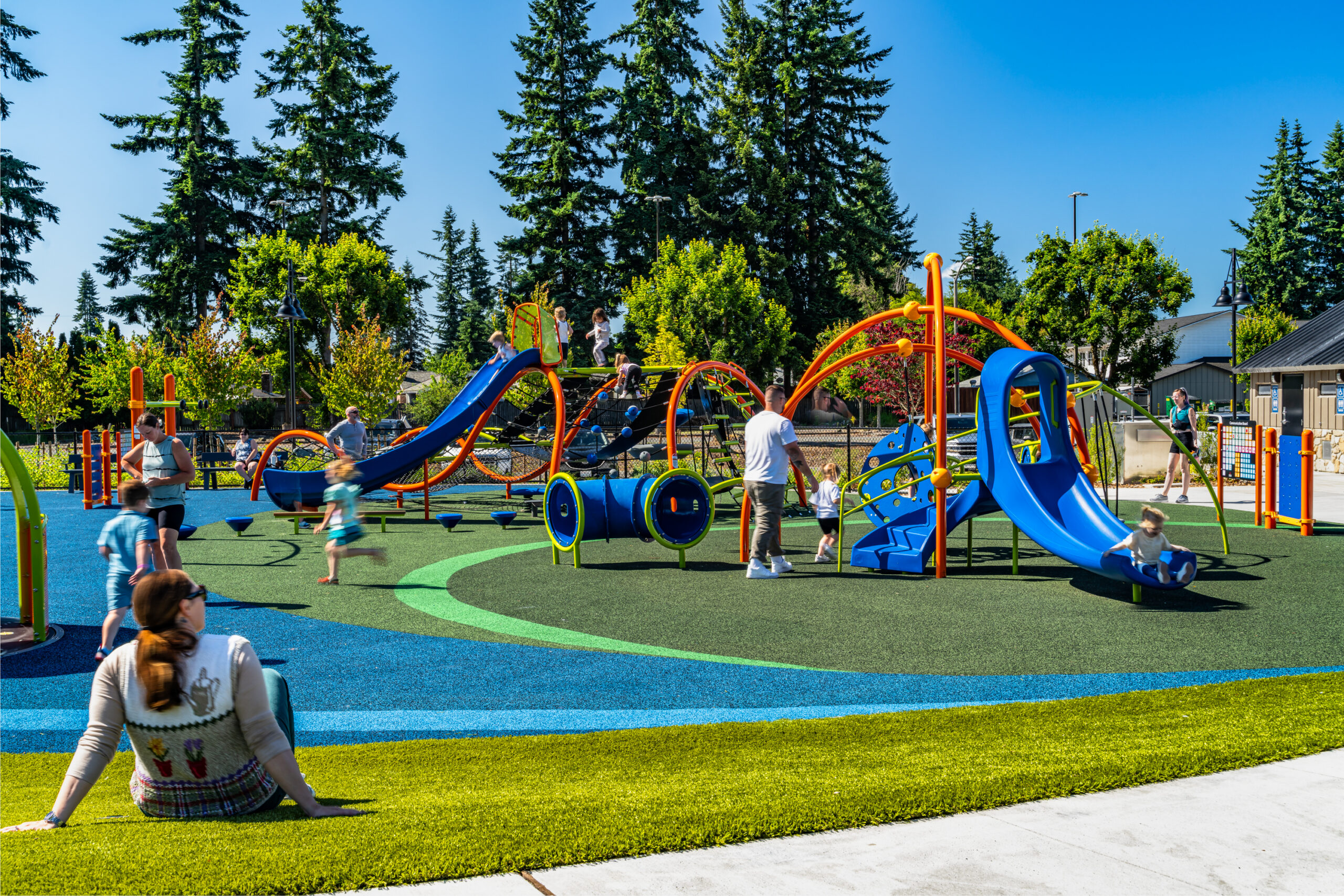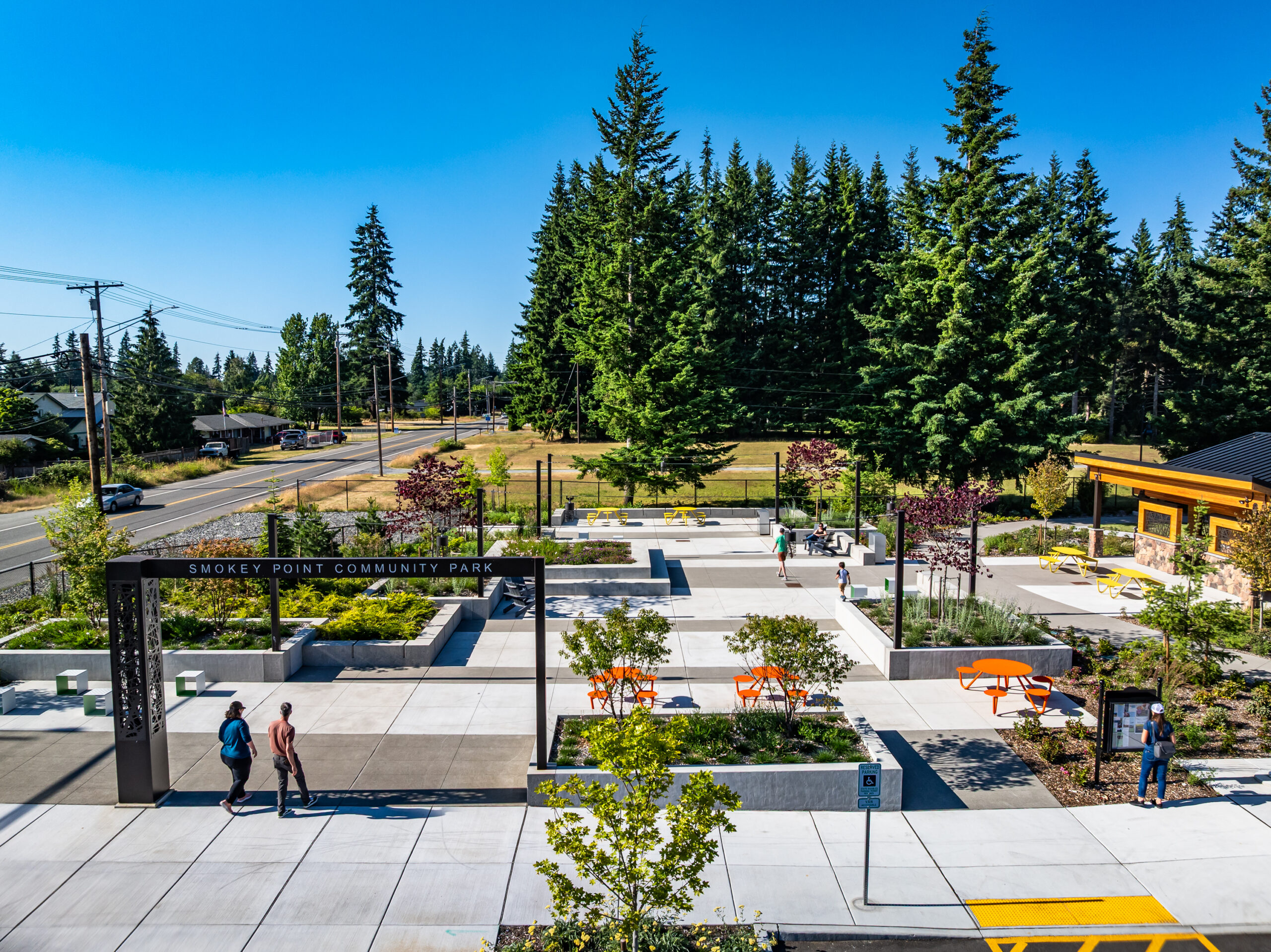 Located adjacent two historical sites of interest – Rex’s Corner and the Smokey Point Café for which the local community is named, Smokey Point Community Park serves as a community/civic center and provides 1.8 acres of recreation to the community, with the overarching vision of creating a community space where concerts, vendor fairs, and opportunities for community events are held and bring the community together. Phase 1 of the project provided a community plaza space with sculptural art elements, lighting, stage, exercise track and great lawn, parking, and bathrooms. Phase 2 of the project included a shelter and playground and was completed in May 2025.