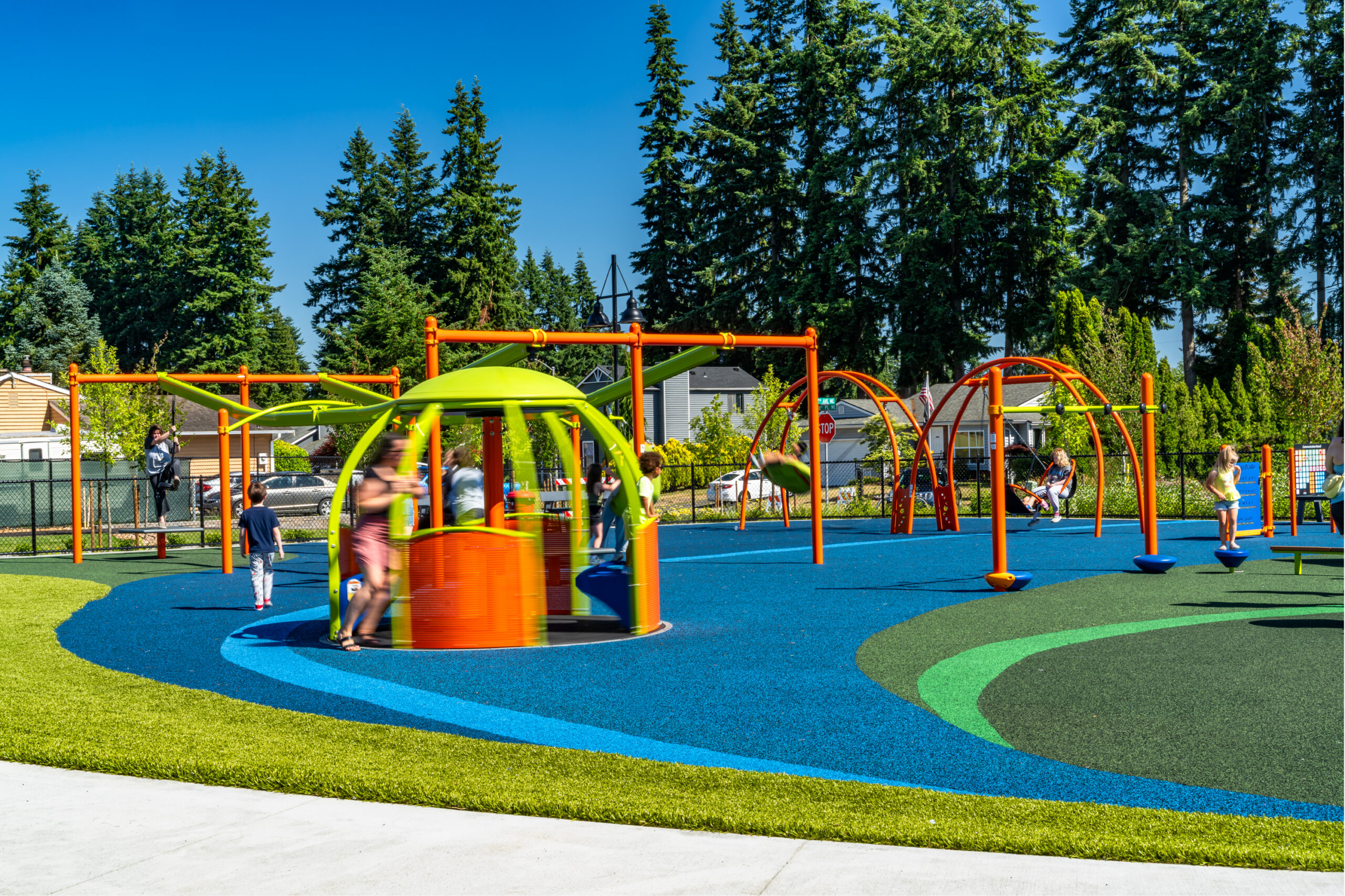 The park features an entry and gathering plaza space with historical interpretive signage elements, a stage and picnic area, restrooms, playground, parking, and a measured walking track around a large flexible oval field. These spaces provide much needed public infrastructure where active and passive recreation can occur, as well as being easily programmed for a variety of Smokey Point community events. The plaza and stage can host concerts and farmers markets while the playground and walking path provide the opportunity for multi-generational activities.